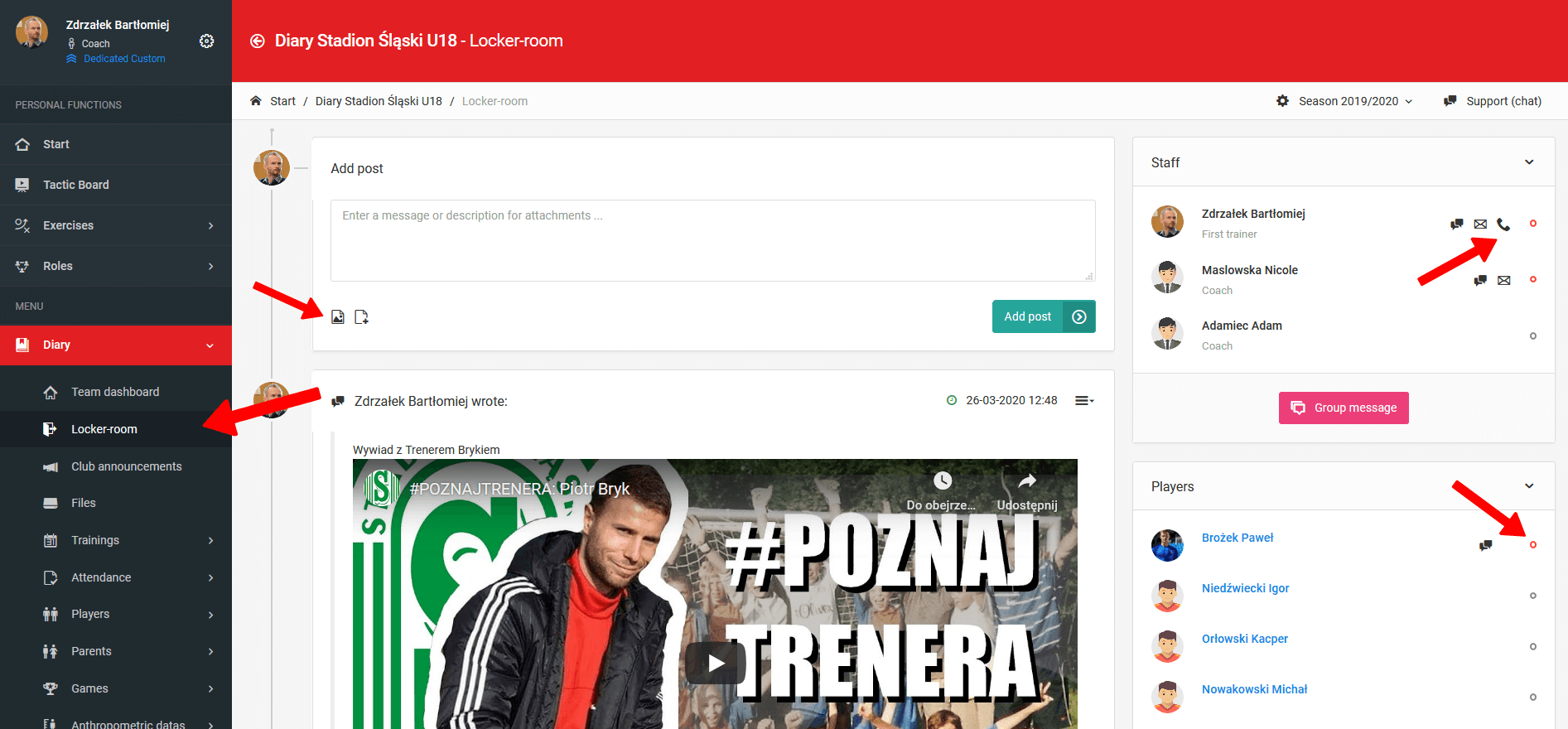 El vestuario y el tablón funcionan como un grupo cerrado de usuarios donde puedes compartir archivos, videos, fotos o enlaces. Además, aquí puedes iniciar una conversación grupal con usuarios seleccionados, así como una conversación privada con un entrenador designado. El vestuario y el tablón también están disponibles a través de la aplicación móvil, y cada publicación que agregas genera una notificación push para los usuarios designados.