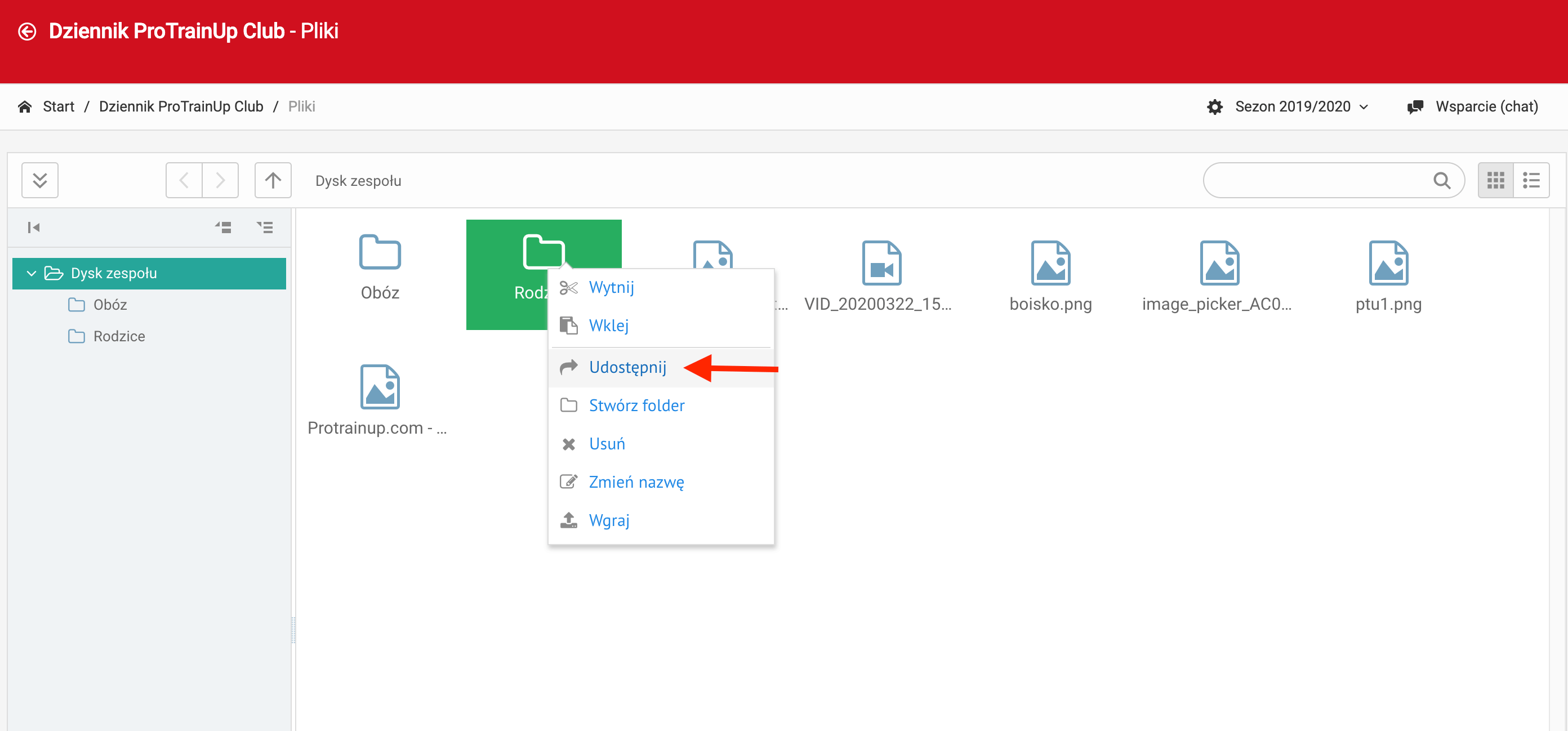 Dodawanie plików do dysków odbywa się dwojako. Pierwszy sposób, to dodanie pliku w szatni lub na tablicy. Tak dodany plik automatycznie ląduje na wirtualnym dysku. Druga opcją to przeciągniecie pliku z dysku komputera do wirtualnego dysku ProTrainUp. Usuwanie pliku odbywa się poprzez wybranie opcji "usuń" z menu kontekstowego danego pliku/folderu.