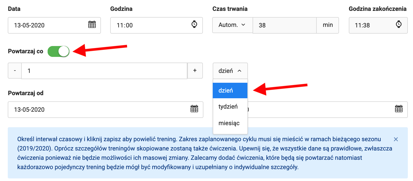 System daje możliwość stworzenie treningu cyklicznego. Aby to zrobić, w oknie tworzenia/edycji treningu zaznacz przycisk "powtarzaj co". Po kliknięciu pojawią się pola, gdzie ustalić możemy interwał czasowy - co ile ma się powtarzać dana jednostka treningowa oraz od kiedy i do kiedy dany trening ma zostać zaplanowany.